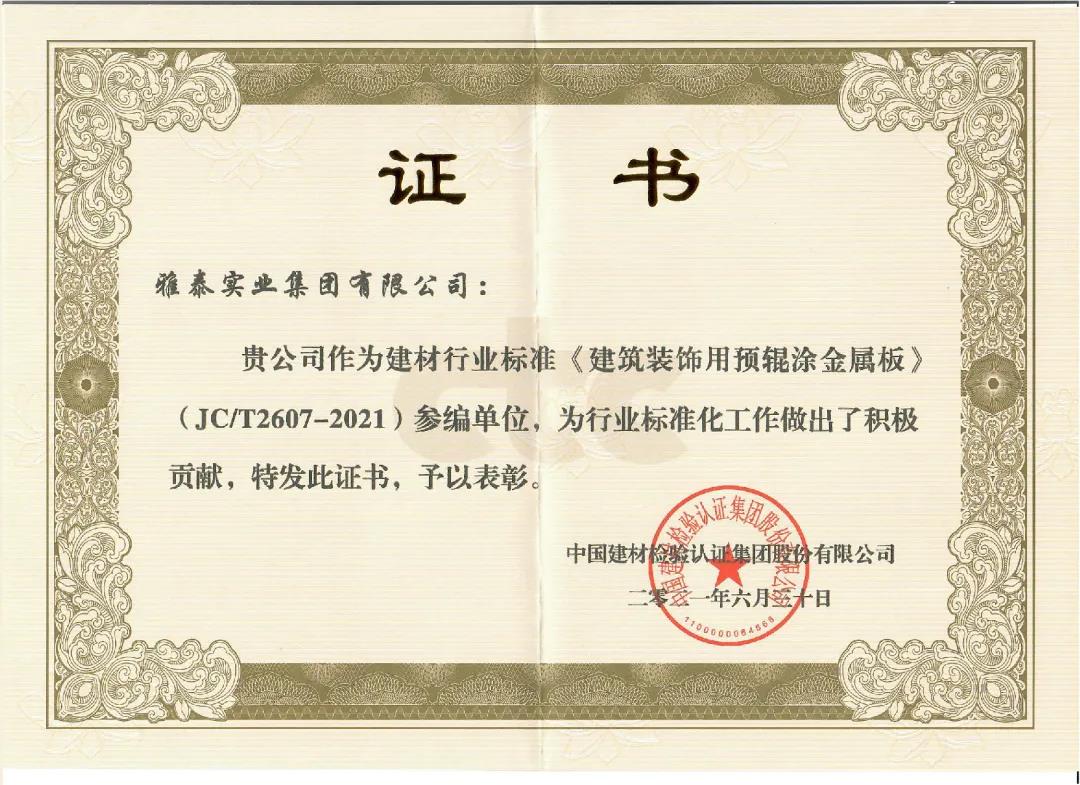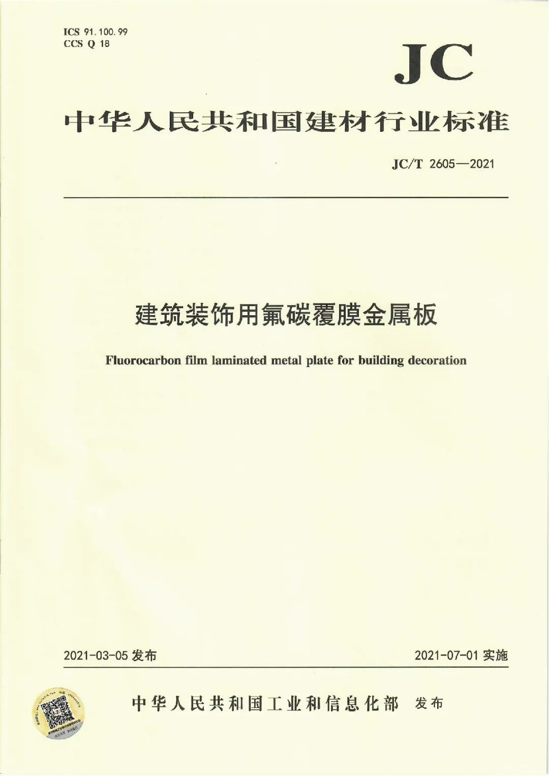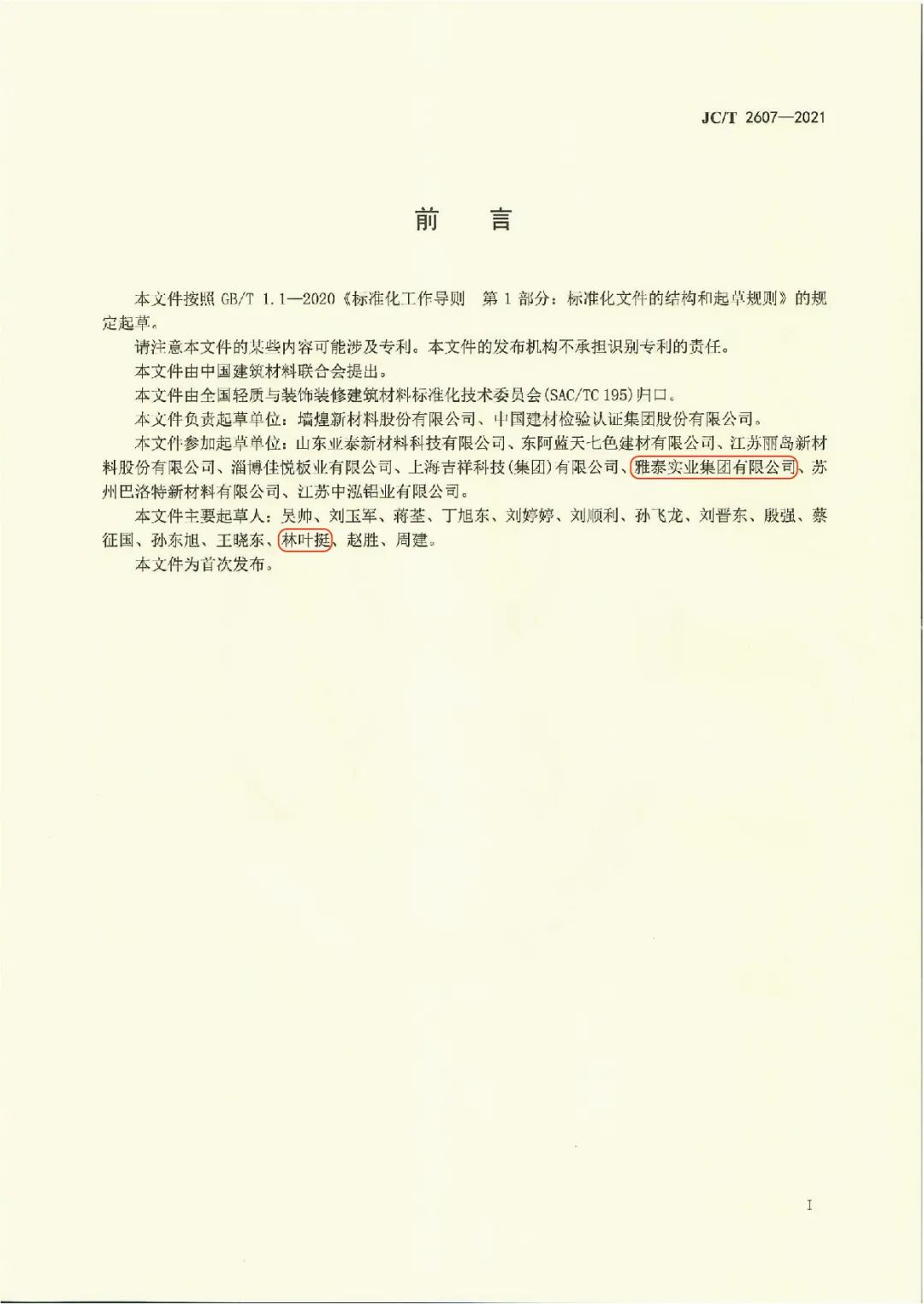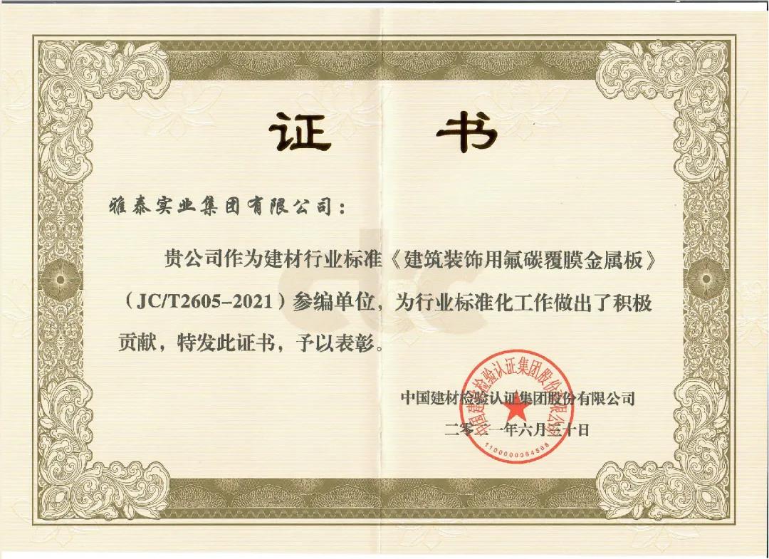 近日,由中國建筑材料聯(lián)合會提出,雅泰實業(yè)集團(tuán)參與起草的《JC/T2605-2021建筑裝飾用氟碳覆膜金屬板》、《JC/T2607-2021建筑屋面用預(yù)輥涂金屬板》兩項行業(yè)標(biāo)準(zhǔn)于2021年3月5日發(fā)布,同年7月1日正式實施,公司技術(shù)部經(jīng)理林葉挺為此次兩項行業(yè)標(biāo)準(zhǔn)的主要起草人之一。