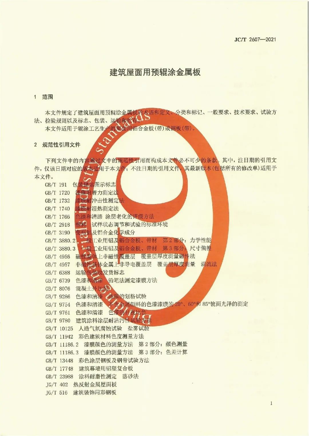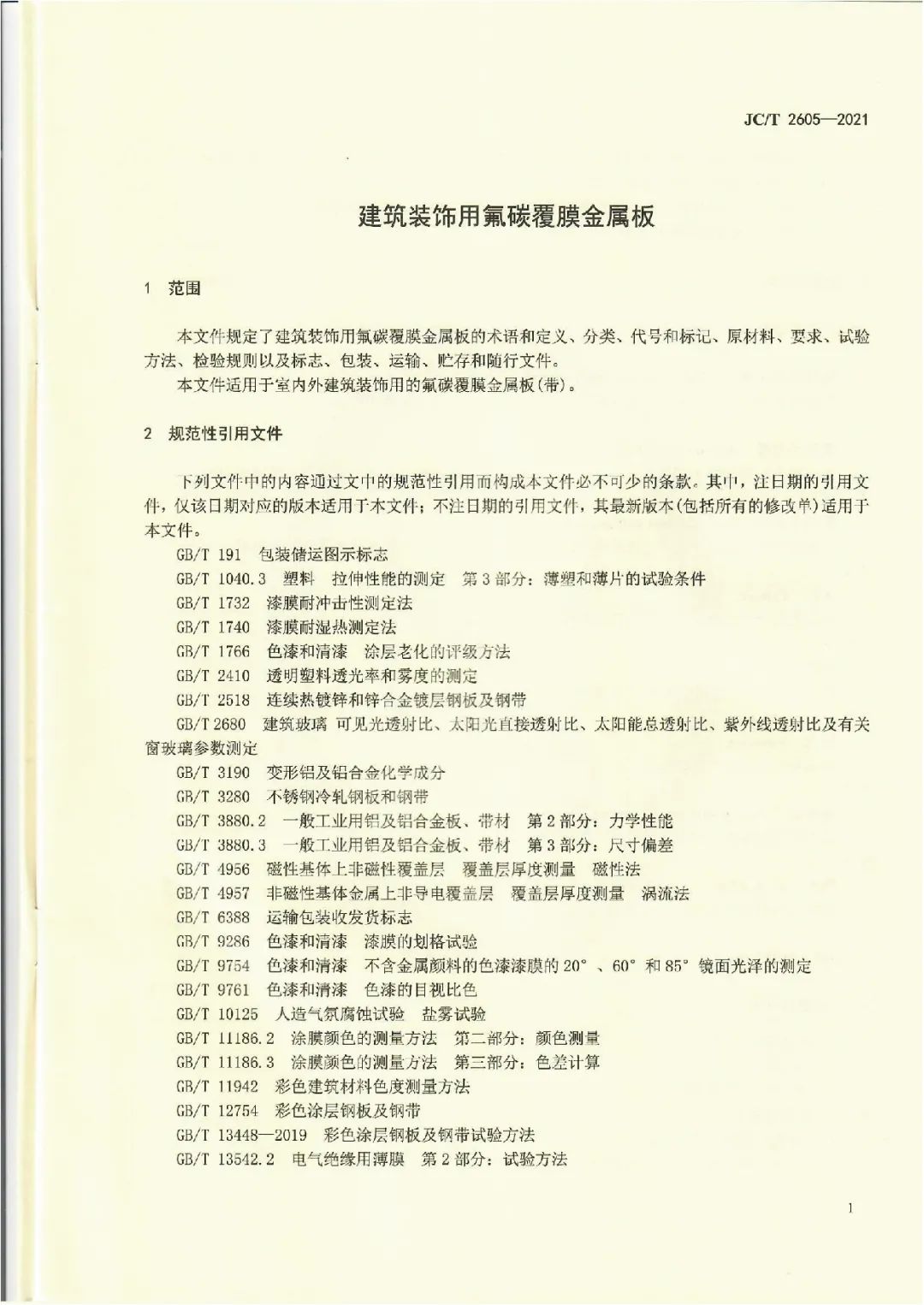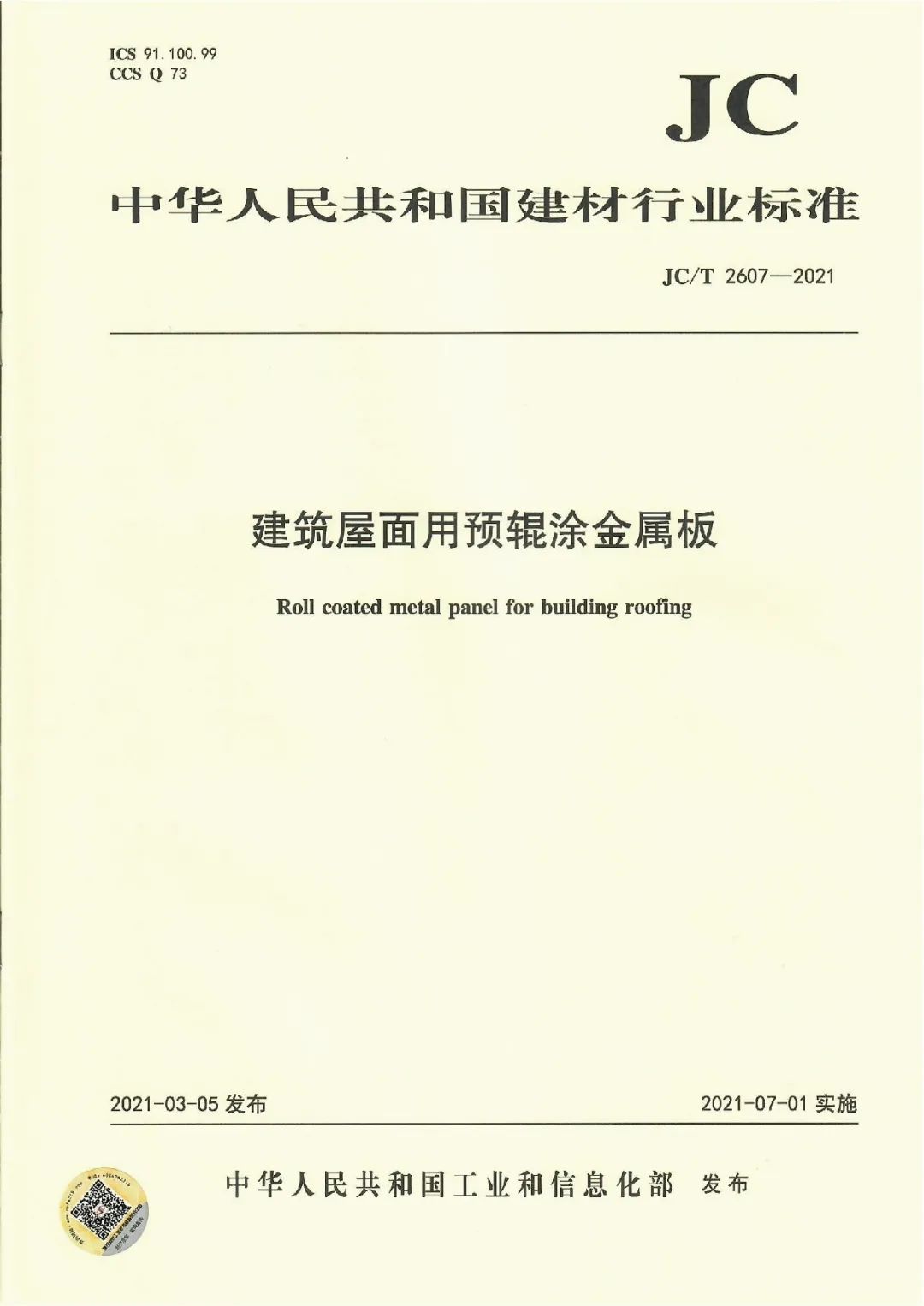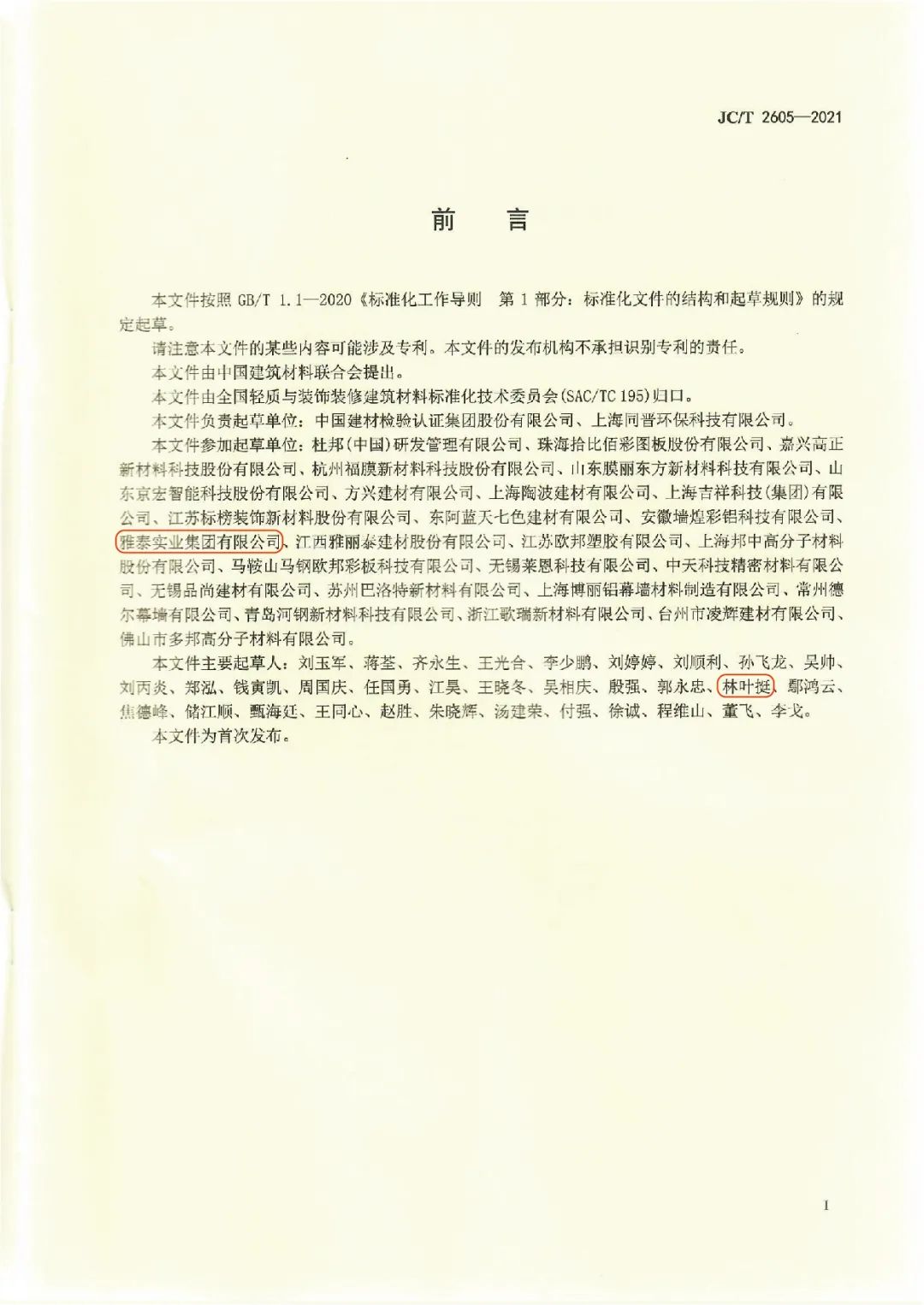 近日,由中國建筑材料聯(lián)合會提出,雅泰實業(yè)集團(tuán)參與起草的《JC/T2605-2021建筑裝飾用氟碳覆膜金屬板》、《JC/T2607-2021建筑屋面用預(yù)輥涂金屬板》兩項行業(yè)標(biāo)準(zhǔn)于2021年3月5日發(fā)布,同年7月1日正式實施,公司技術(shù)部經(jīng)理林葉挺為此次兩項行業(yè)標(biāo)準(zhǔn)的主要起草人之一。