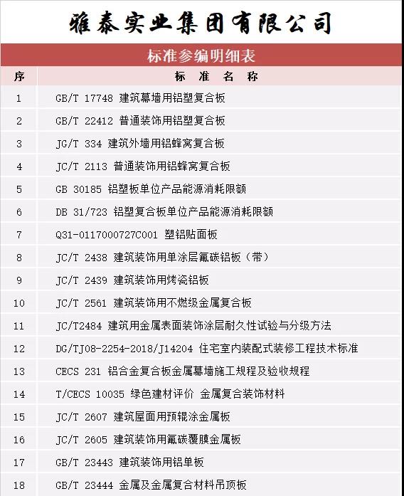 截至目前,雅泰作為參編單位參與國家標(biāo)準(zhǔn)、行業(yè)標(biāo)準(zhǔn)等各項標(biāo)準(zhǔn)共計 18 項(詳見參編標(biāo)準(zhǔn)一覽表),逐漸成為行業(yè)推進(jìn)標(biāo)準(zhǔn)化工作的主力軍之一,不斷證明公司地位及整體生產(chǎn)水品、產(chǎn)品實力等已得到業(yè)內(nèi)認(rèn)可。